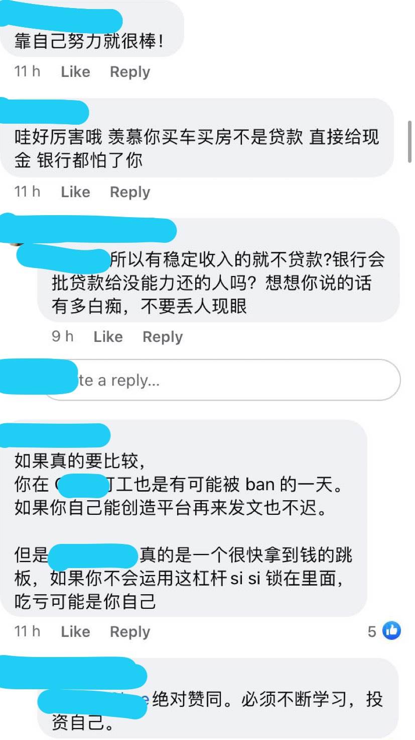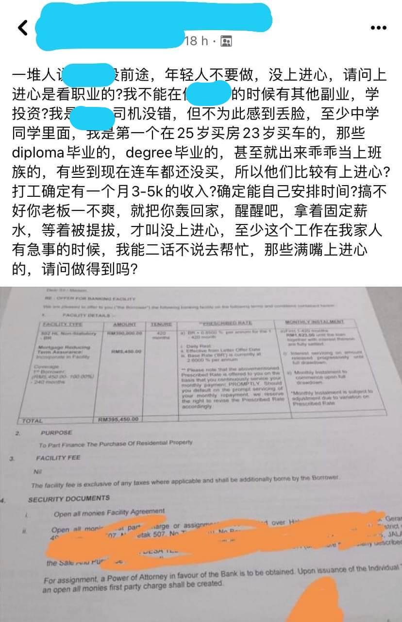 他又写到,“那些diploma(文凭)毕业的,degree(学士学位)毕业的,那些按部就班老老实实做上班族的,到现在还没有买车,他们算很有上进心?”