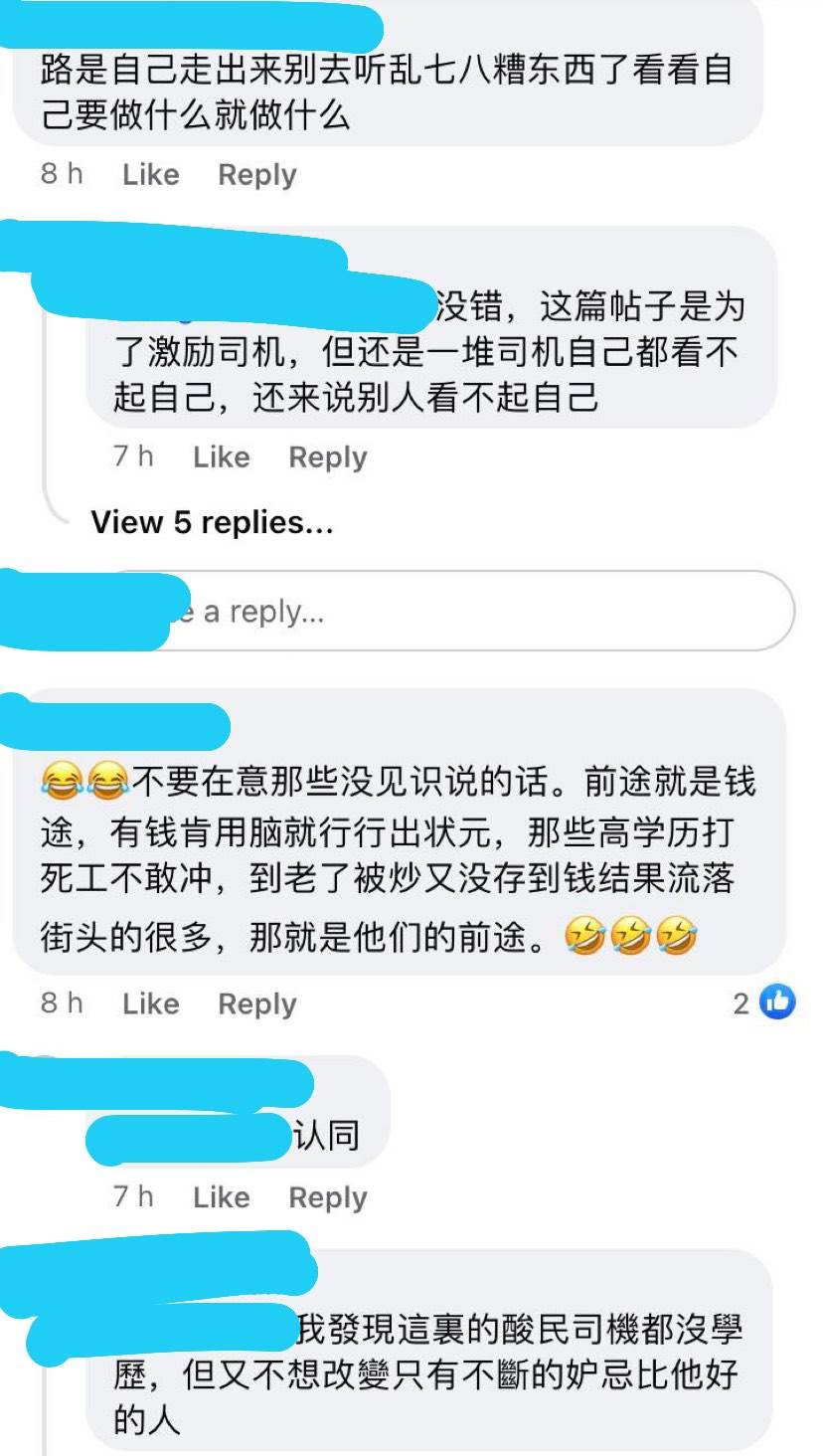 但也有网友留言,“如果真的要比较,你做电召车,说不好就会被 ban (封号)。“司机没有积累的经验,没有商业社交圈子,没有晋升,没有公司的公积金,没有 bonus,没有医疗补贴,没有年假,假如你从25岁驾到52岁,薪水还是一样只有3k至5k”,“你错了。