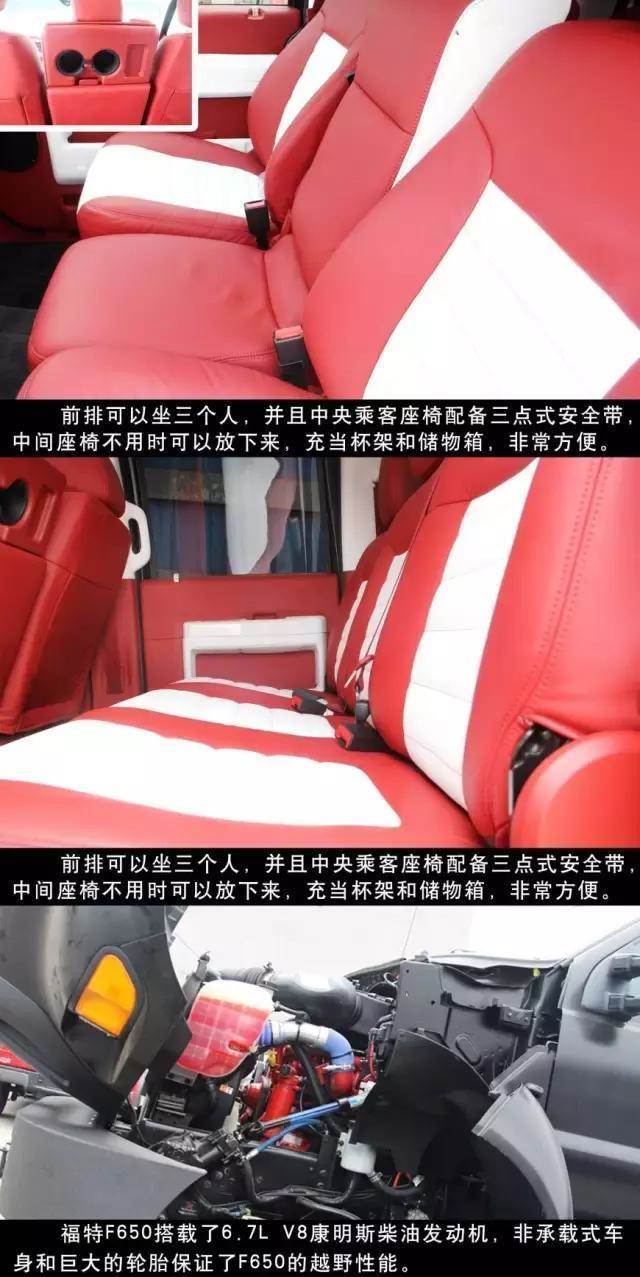 動力方面,福特F650搭載了6.7L V8康明斯柴油發動機,非承載式車身和巨大的輪胎保證了F650的越野性能。福特F650排量:6.7L 馬力:325hp 功率:239kw最大扭矩:800n-m 變速箱:6速手自一體變速箱質量:前重3855Kg后重7937Kg總重11792Kg 長:6.5米寬:2.69米高:2.86米輪胎高:1.11米輪胎規格:425/65R22.5。